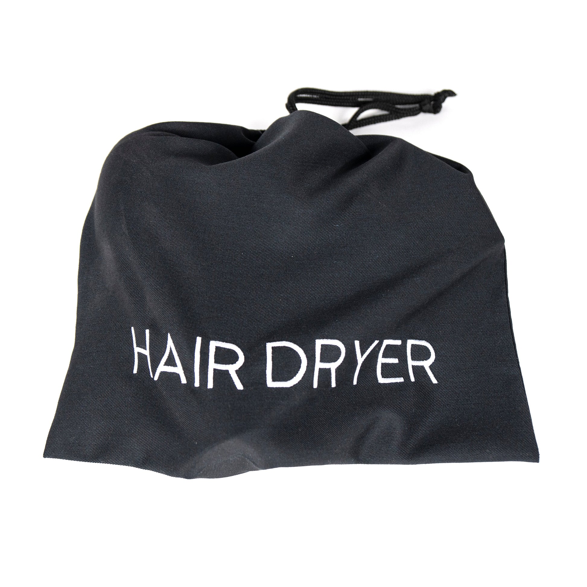 - "HAIR DRYER" embroidered in white on bag